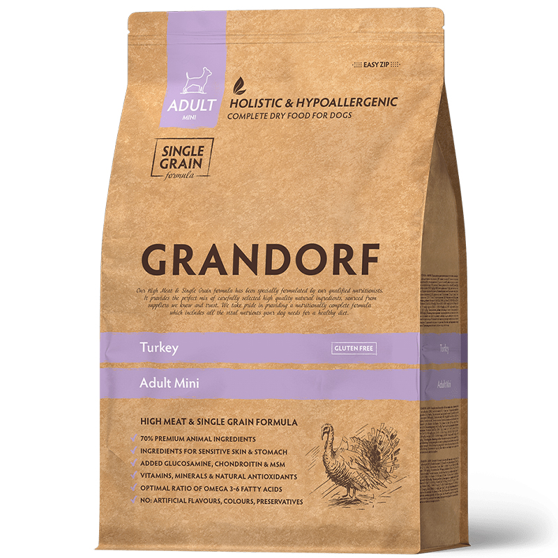 Грандорф (Grandorf Mini Turkey) Индейка для взрослых собак мелких пород с нормальной активностью, чувствительным пищеварением или склонных к аллергии. Свежее гипоаллергенное и питательное мясо индейки благотворно влияет на пищеварительную систему собаки. Благодаря монопротеиновой формуле, гипоаллергенным ингредиентам, одному виду зерновых, отсутствию глютена, корм имеет отличную усвояемость, высокую пищевую ценность и помогает оставаться вашему питомцу здоровым и жизнерадостным на протяжении долгих лет жизни.