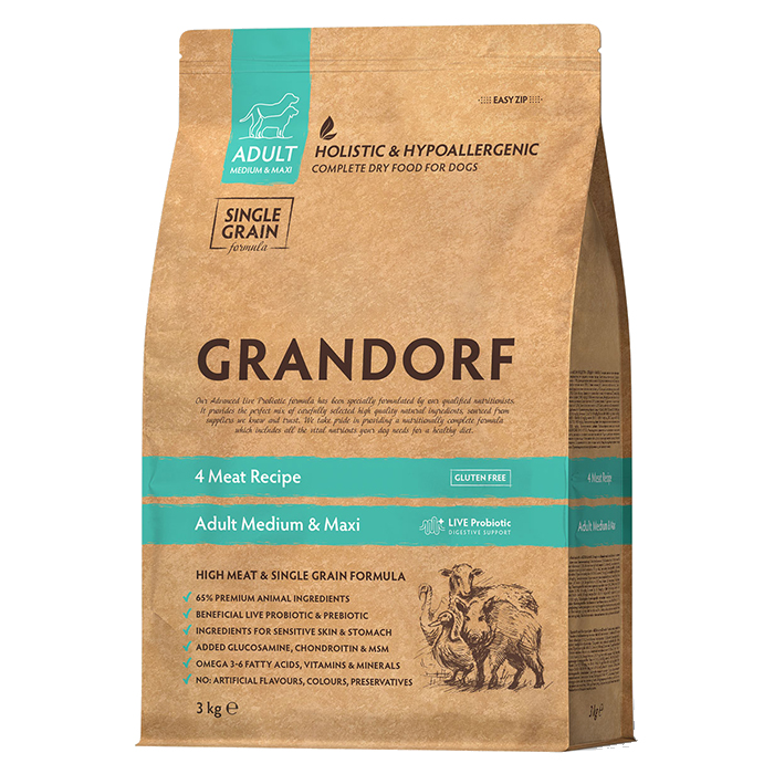 Грандорф (Grandorf Probiotic) четыре вида мяса для взрослых собак средних и крупных пород - идеально подходит питомцам с чувствительным пищеварением или склонным к аллергии. Миллиард живых пробиотиков ежедневно поддерживают микрофлору кишечника, улучшают пищеварение, усвоение питательных веществ и предотвращают аллергию.