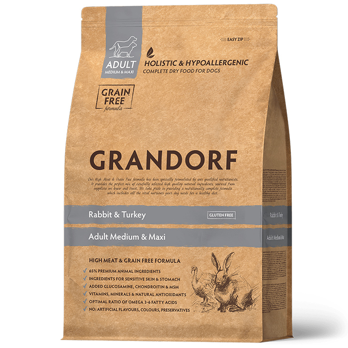 Грандорф (Grandorf Rabbit&Turkey Medium/Maxi) кролик с индейкой для собак средних и крупных пород - беззерновой гипоаллергенный состав в сочетании с диетическим мясом утки и мясом индейки помогает предотвратить аллергические реакции и пищевую непереносимость, обеспечивая иммунное и пищеварительное здоровье. Деликатный способ приготовления сохраняет все полезные свойства и питательные вещества натуральных ингредиентов обеспечивают отличное физическое состояние питомца.
