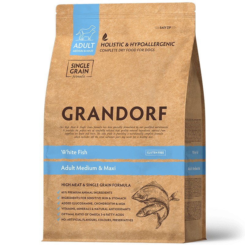 Grandorf White Fish&Rice - натуральное, гипоаллергенное питание класса Холистик для взрослых собак всех пород от 1 года. Идеально подходит питомцам, требующим особого внимания и ухода за кожей и шерстью, а также питомцам с чувствительным пищеварением или склонным к аллергии. Формула богата мясом океанических рыб, насыщена Омега-6, Омега-3 и необходимыми аминокислотами. Тщательно отобранные, натуральные гипоаллергенные ингредиенты, помогают предотвратить аллергические реакции и пищевую непереносимость, обеспечивая иммунное и пищеварительное здоровье. Деликатный способ приготовления сохраняет все полезные свойства и питательные вещества натуральных ингредиентов обеспечивают отличное физическое состояние питомца.