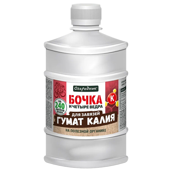 Бочка и четыре ведра гумат калия - органоминеральная добавка, обеспечивающая полноценное развитие ягодных, овощных, плодовых и комнатных растений.