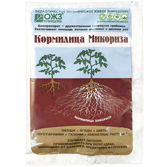 Кормилица Микориза для развития корневой системы растений - торф башкирский с микоризной грибницей увеличивает площадь питания растений в десятки раз. Препарат содержит все необходимые питательные вещества для полноценного развития и роста растения, обогащен сбалансированным витаминным и минеральным комплексом, макро- и микроэлементами. Кормилица обеспечитвает растения элементами питания и водой, а растения снабжают грибницу сахарами (углеводами). Урожаи увеличиваются в 1,5-2 раза.