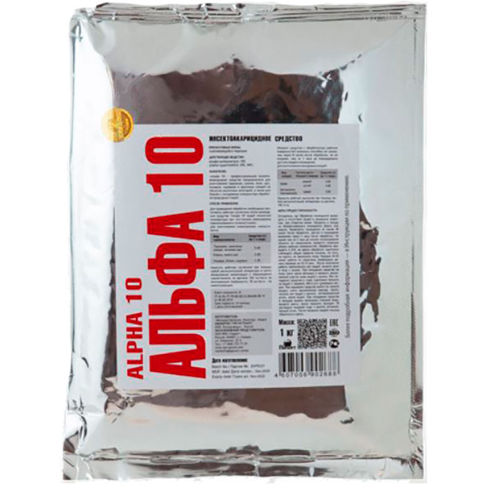 Альфа 10 - инсектоакарицидное средство, представляет собой смачивающийся порошок белого цвета без запаха.