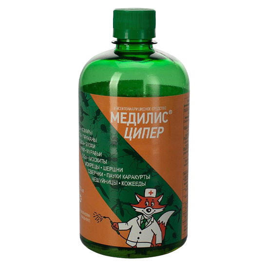 Средство инсектоакарицидное Медилис-Ципер представляет собой прозрачную жидкость от светло-желтого до жёлтого цвета. Применяется в виде водных рабочих эмульсий, которые содержат 0,01 – 0,50% циперметрина.