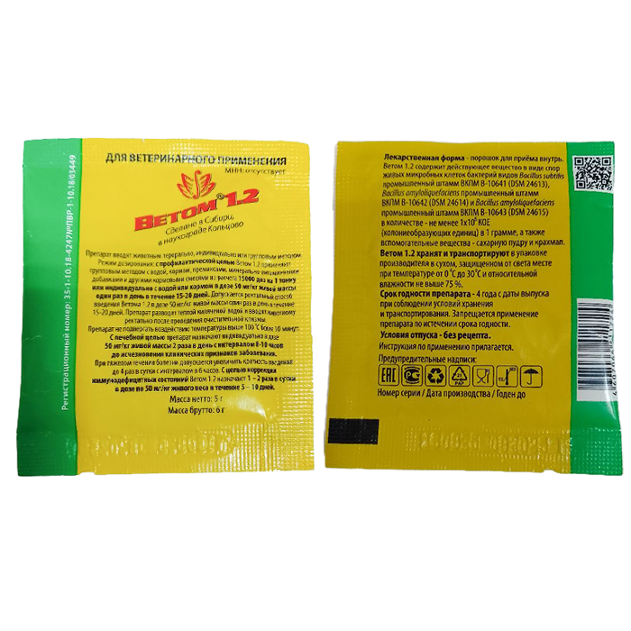 Бактерии Bacillus subtilis ВКПМ В-10641 выделяют в кишечнике животных антибиотикоподобные субстанции, ферменты, другие биологически активные вещества, под воздействием которых нормализуются: биоценоз кишечника; кислотность среды; пищеварение; всасывание и метаболизм железа, кальция, жиров, белков, углеводов, триглицеридов, аминокислот, дипептидов, сахаров, солей желчных кислот. Бактерии Bacillus amyloliquefaciens ВКПМ В-10642 и Bacillus amyloliquefaciens ВКПМ В-10643, используемые для изготовления препарата, отличаются высокой устойчивостью к пищеварительным сокам и ферментам желудочно-кишечного тракта и способностью к быстрому его заселению. В кишечнике животных споры бактерий трансформируются в вегетативные формы и выделяют антибиотикоподобные субстанции, ферменты, другие биологически активные вещества, под воздействием которых: нормализуются: биоценоз кишечника; кислотность среды; пищеварение; всасывание и метаболизм железа, кальция, жиров, белков, углеводов, триглицеридов, аминокислот, дипептидов, сахаров, солей желчных кислот. Ветом 1.2 стимулирует клеточные и гуморальные факторы иммунитета, повышает устойчивость животных и птицы к инфицированию вирусными и бактерийными агентами.
