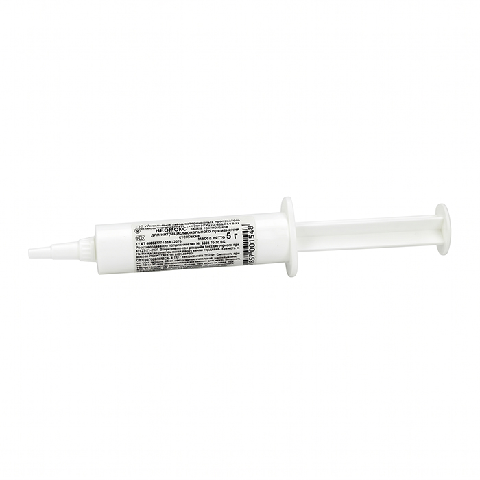 Неомокс (Neomoxum) - суспензия для интрацистернального введения для лечения коров при клиническом мастите в период лактации, вызванным чувствительными к амоксициллину и неомицину микроорганизмами. По внешнему виду препарат представляет собой суспензию от белого до кремового цвета. Допускается расслоение при хранении.
