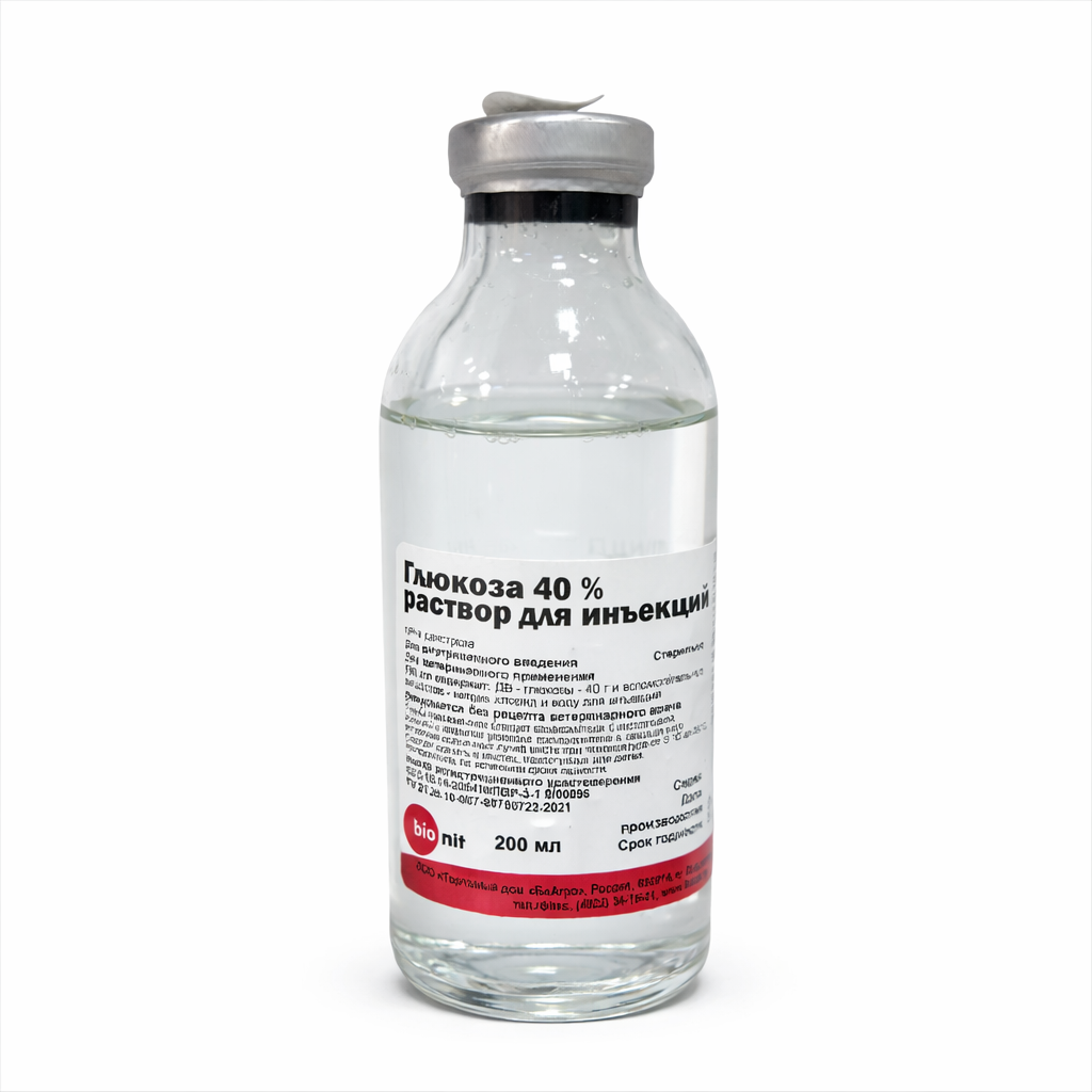 Глюкоза 40% - лекарственное средство в форме раствора для инъекций, применяемое при обезвоживании и интоксикации организма животных. По внешнему виду представляет собой прозрачную бесцветную или слегка желтоватую жидкость.