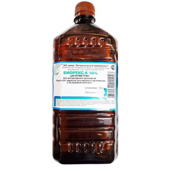 Биорекс К 10% - ветеринарный препарат для борьбы против вшей, мух, гнуса, иксодовых и чесоточных клещей, пухопероедов кур в других эктопаразитов животных, а также для дезинсекции и дезакаризации объектов ветеринарного надзора. По внешнему виду Биорекс-К представляет собой однородную маслянистую прозрачную жидкость желто-оранжевого цвета, допускается опалесценция. С водой образует эмульсию молочно-белого цвета.