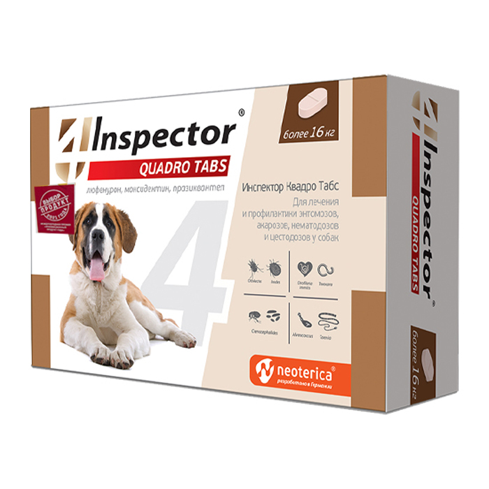 Инспектор Квадро Табс (Inspector Quadro Tabs) - таблетки для приема внутрь для кошек и собак 16кг. Препарат представляет собой таблетки от светло-бежевого до бежевого цвета овальной формы с глубокой риской по центру, массой 1500мг.