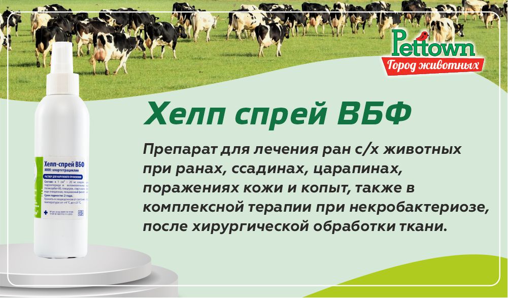 Хелп-спрей ВБФ — это высокоэффективный препарат, предназначенный для лечения ран, ссадин, царапин и повреждений кожи у различных животных: крупного и мелкого рогатого скота, лошадей, свиней, птицы и мелких домашних животных. Он также идеально подходит для комплексной терапии при некробактериозе и после хирургических вмешательств.